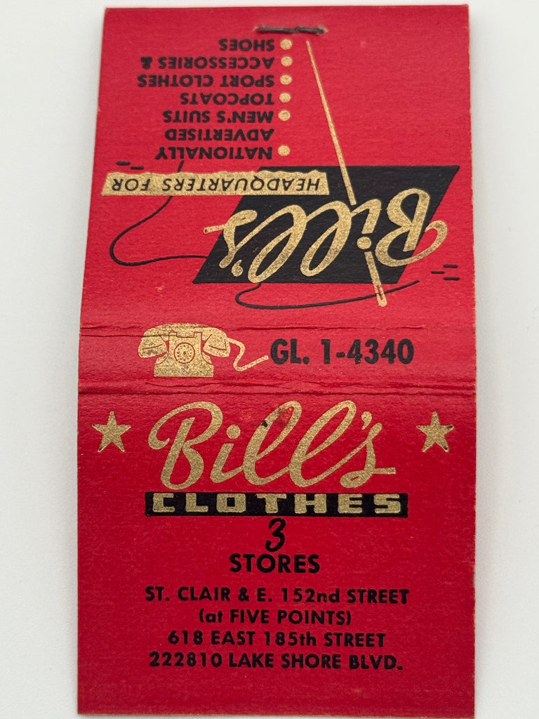 "Bill’s Clothes" Cleveland, OH Vintage Feature Matchbook