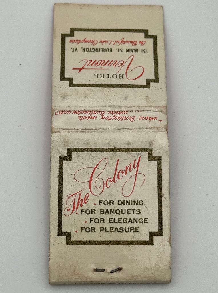 "Hotel Vermont / The Colony" Burlington, VT Vintage Feature Matchbook