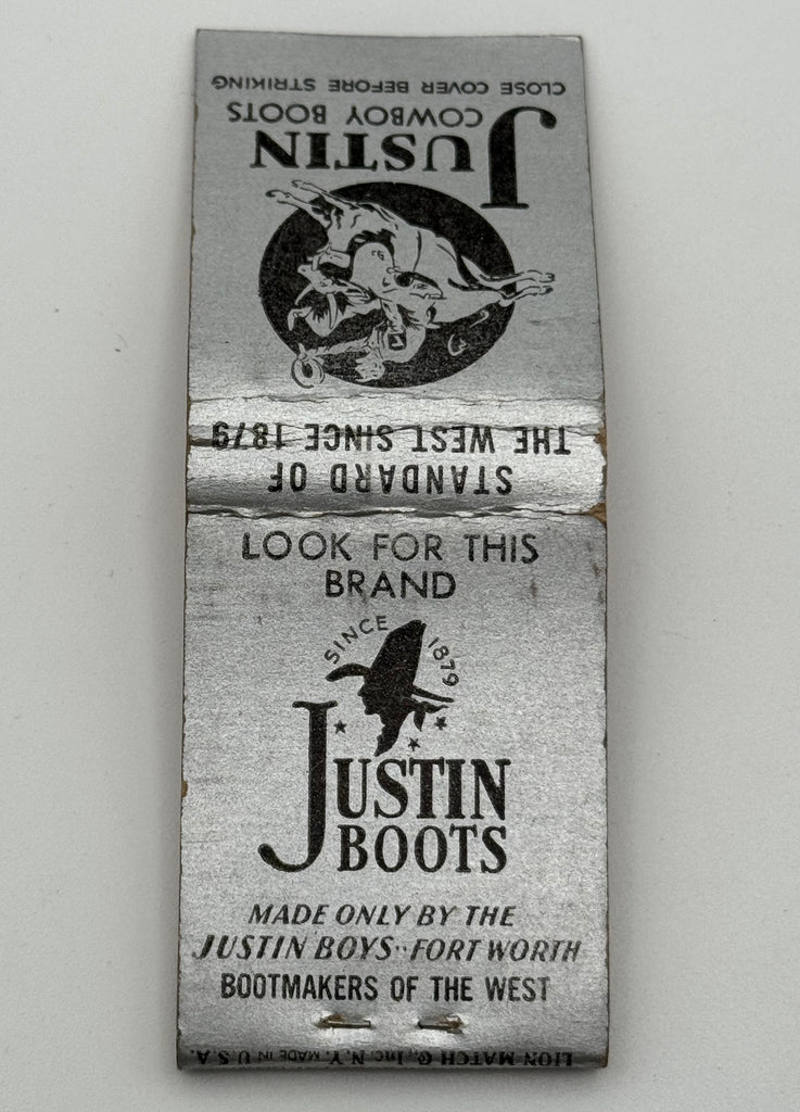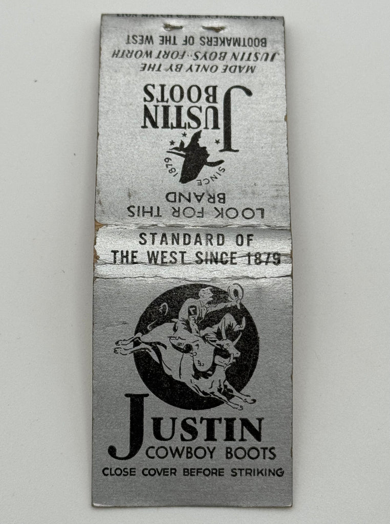 "Justin Cowboy Boots" Fort Worth, TX Vintage Feature Matchbook